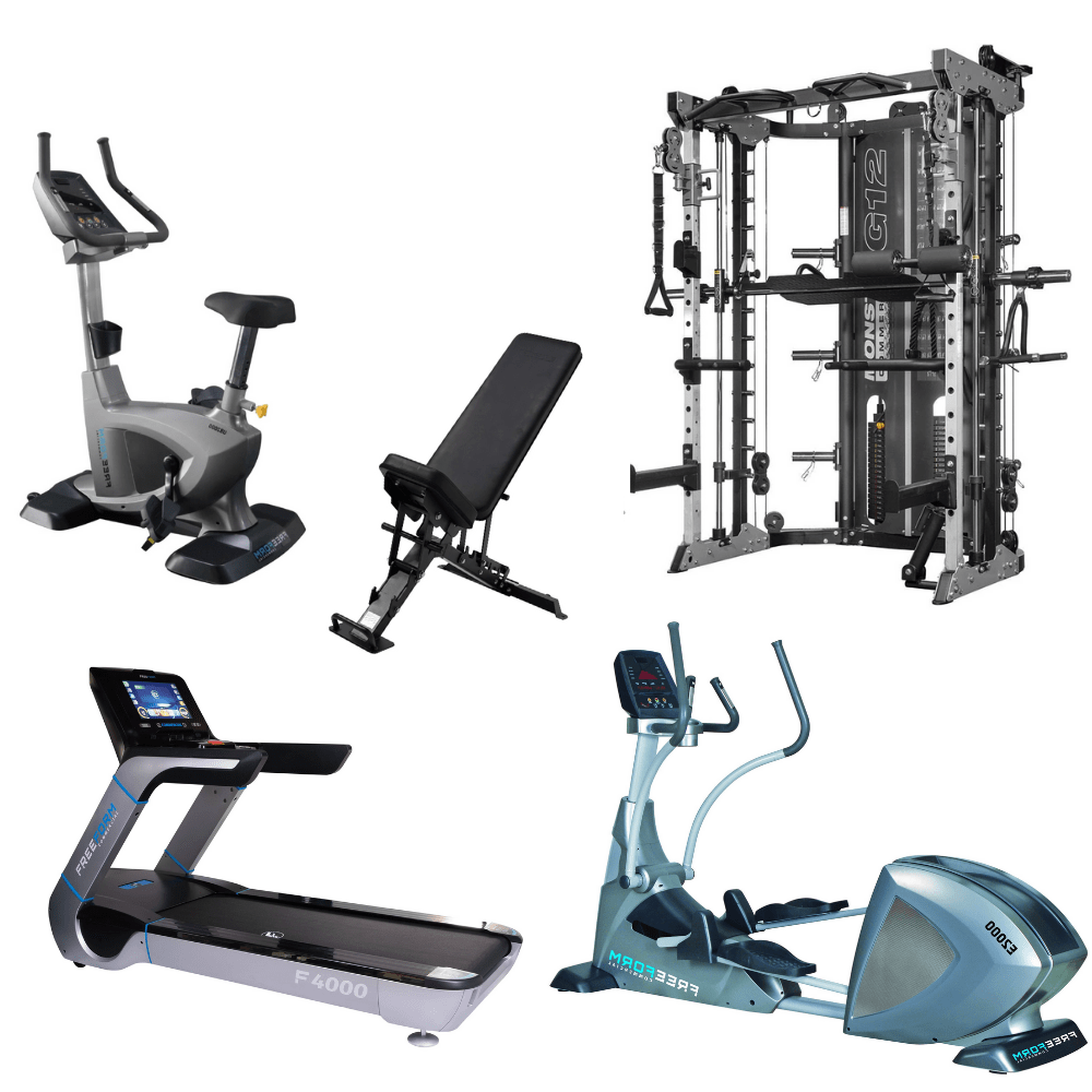 The Body Corporate Package 5 consists of the FreeForm F4000 Commercial Treadmill, Freeform UB2000 Commercial Self Generating Upright Bike, Freeform E2000 Commercial Self Generating Elliptical Trainer, Force USA G12 All-In-One Trainer and Force USA Commercial FID Bench