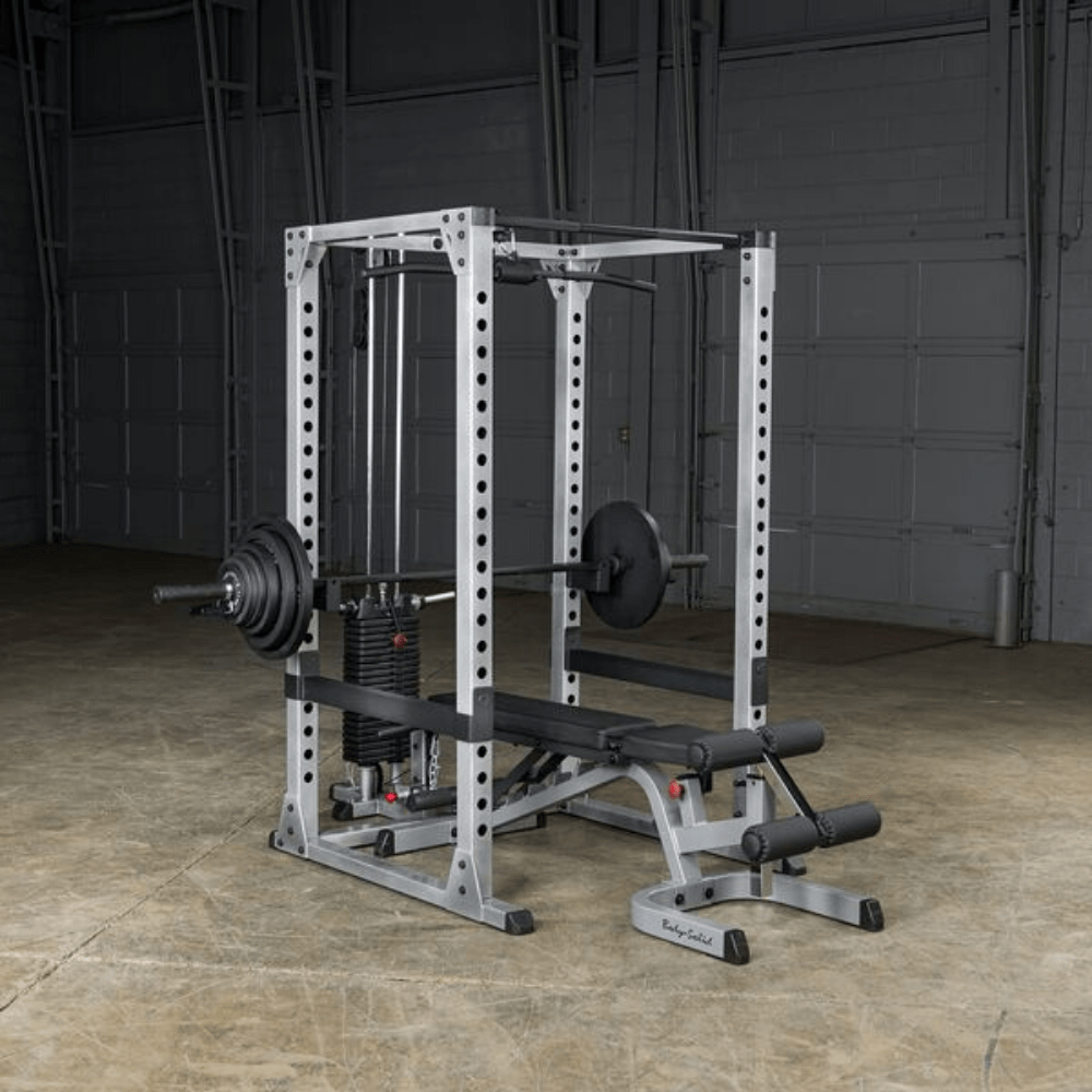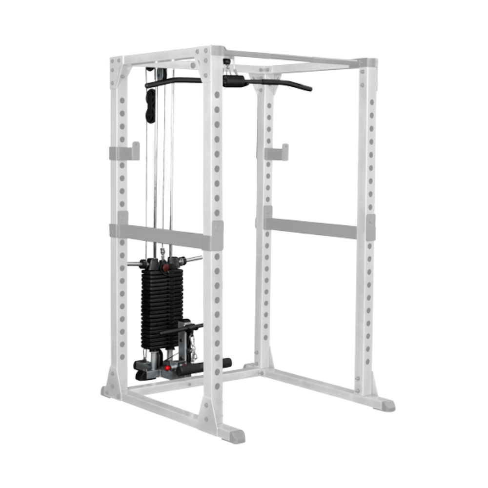 Transform your Body-Solid Power Rack into a multi-workout machine. This Lat Attachment will help you build a wider, beefier Back and/or stronger and bigger Biceps and Triceps. Features nylon coated, aircraft quality (2200 Lb. test) cables. The Plate-Load carriage on this Lat Attachment features 1" diameter weight posts that will accommodate Standard or Olympic Weight Plates. Includes Lat Bar and Low Row Bar.