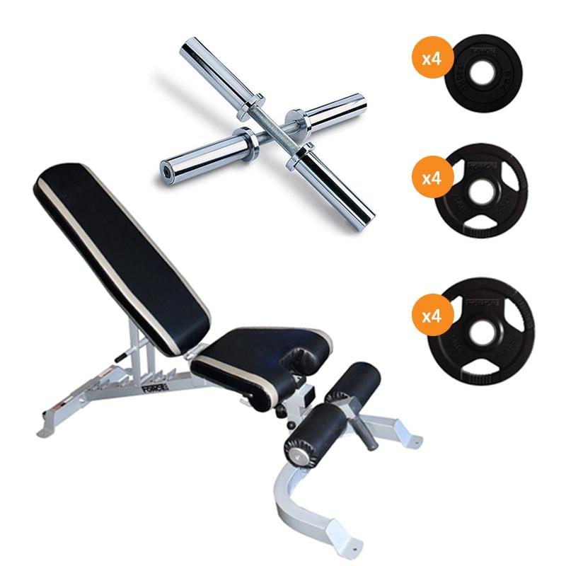 The Force USA FID Bench & Dumbbell Package consists of most Olympic trainer/weightlifter's needs. It has a Flat inclining or declining bench, an Olympic grade dumbbell and Olympic grade weight plates.