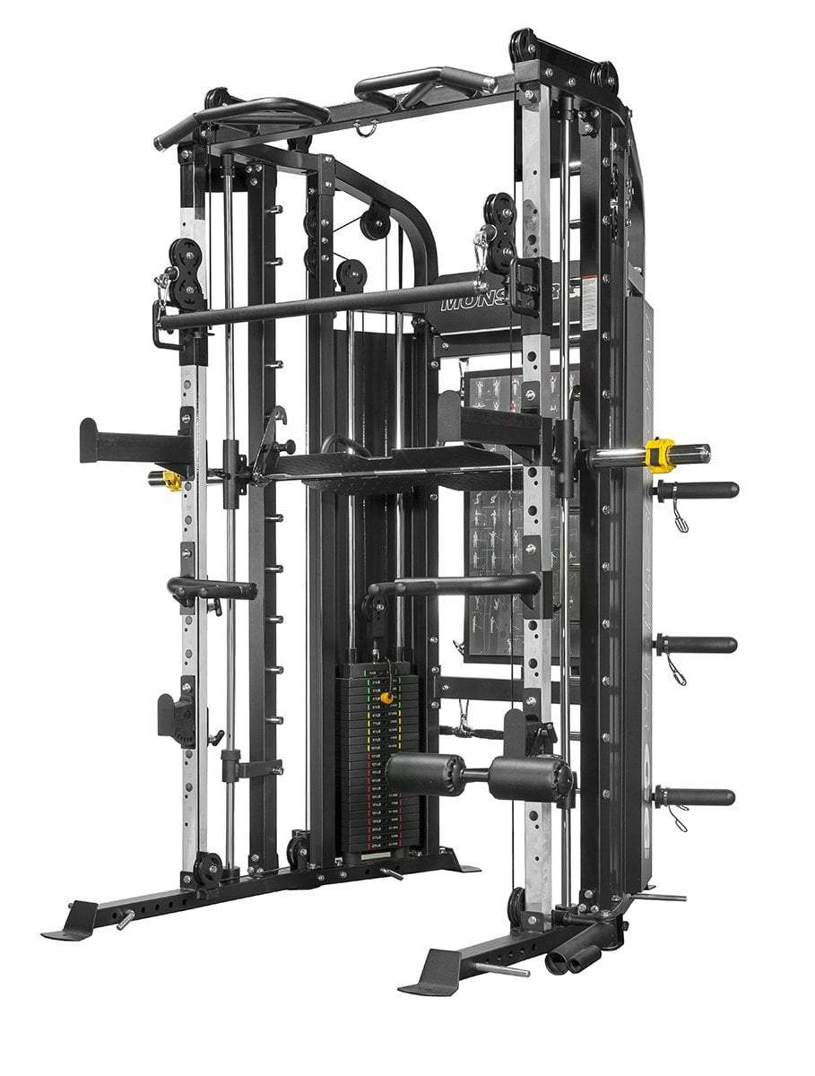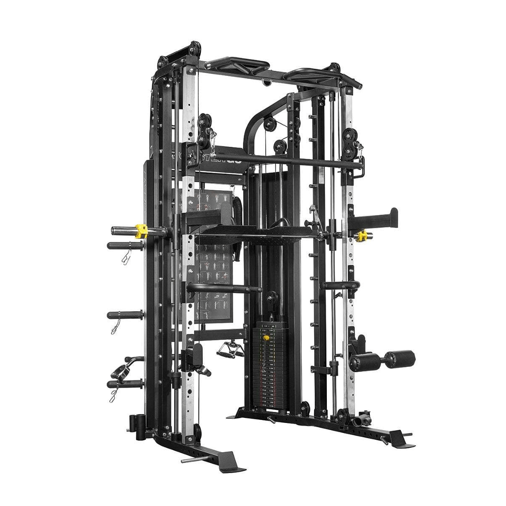 Commercial Smith Machine & commercial grade guide rails providing ultra smooth movement. Fitted with safe lock & release mechanics and safety catch allowing you to max out your training without the need for a spotter.