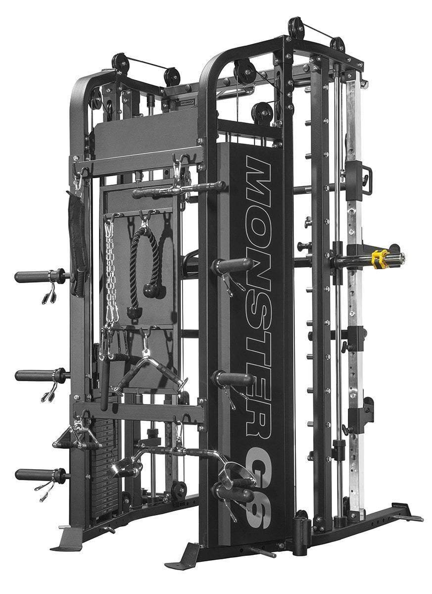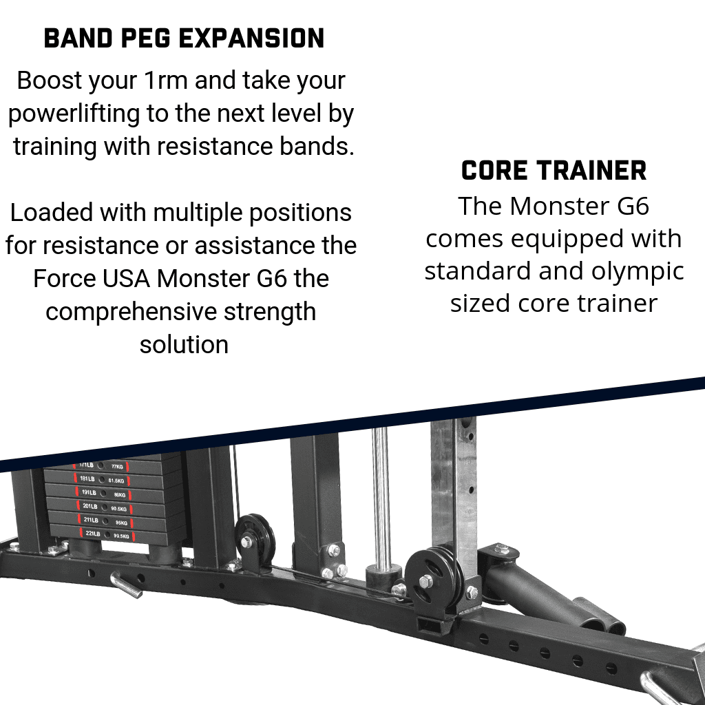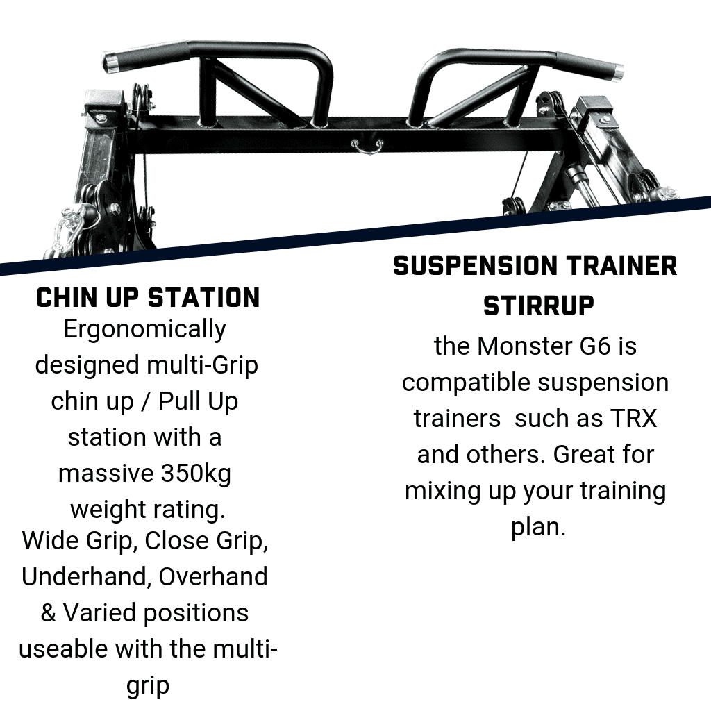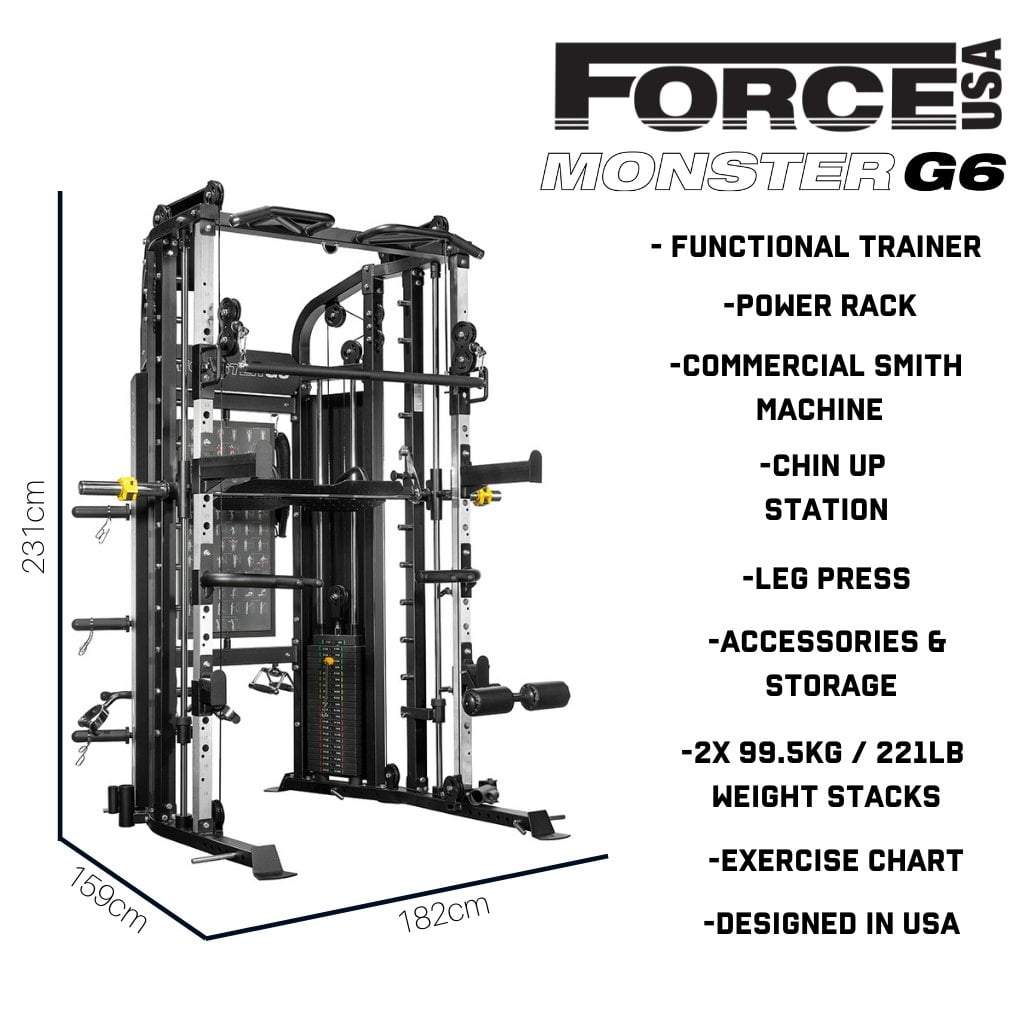 Loaded with a huge range of attachments to give you the competitive edge, The Force USA G6 All-In-One Trainer has included Leg Press, Core Trainer, Knee support for lat pull down, Lat Pull Down Bar, T-Bar, Olympic Lock Collars, Multi-Grip Dip Handles, Barbell J-hooks, Safety Spotting Arms & Many More attachments. Keep your training space clean and tidy with built-in storage. The Force USA development team have added 6x olympic sized weight plate holders, Olympic & Standard Barbell Holders & Storage Hooks for all of your attachments.