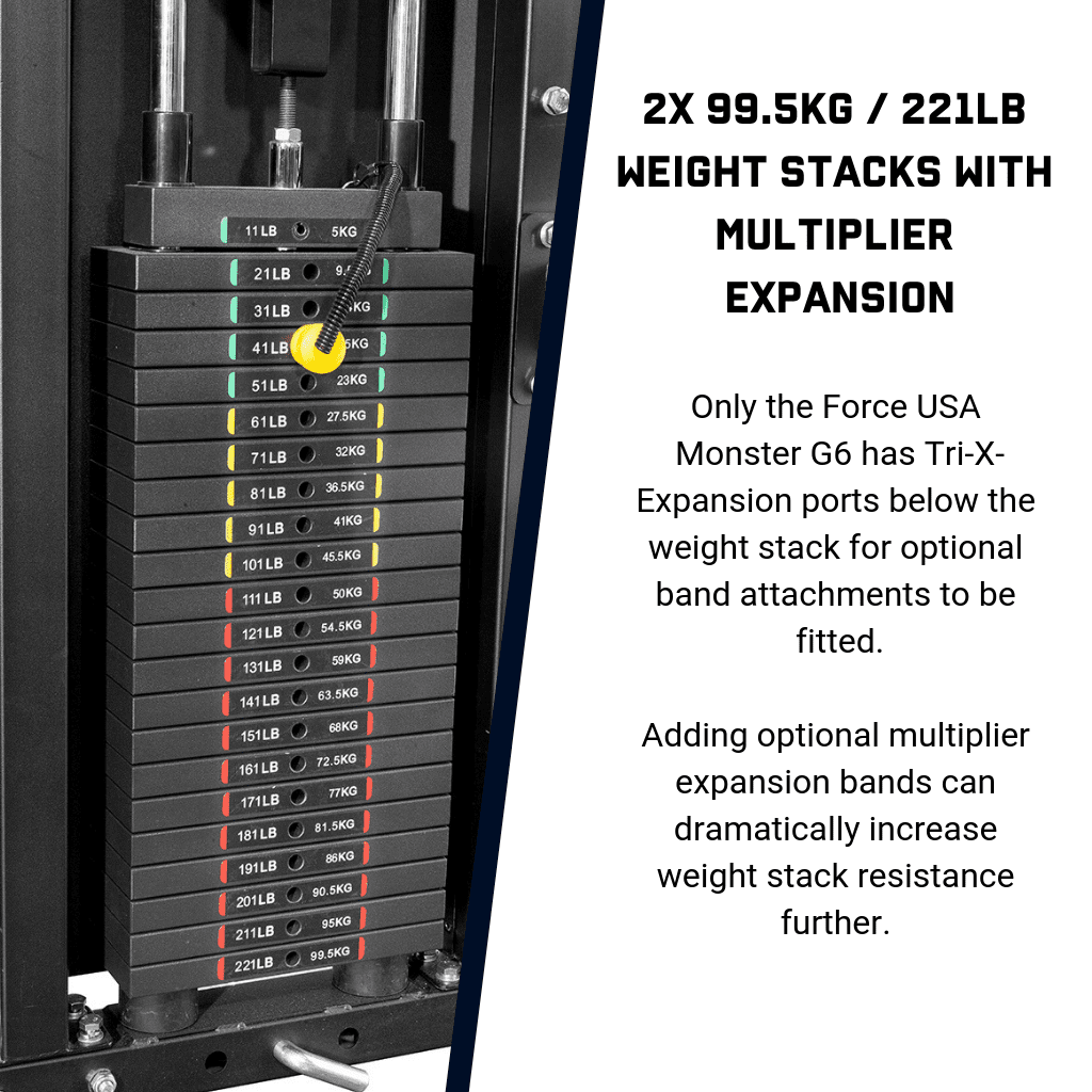 The Force USA G6 All-In-One Trainer is equipped with 2x 99.5kg/221lb weight stacks located at the back of the unit for complete resistance control on over 75+ different exercises. |