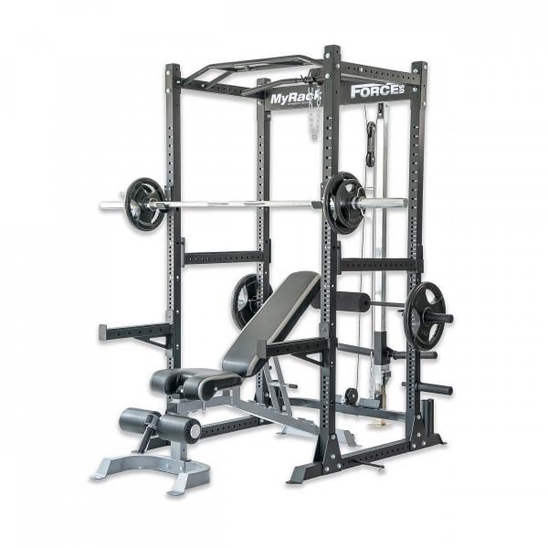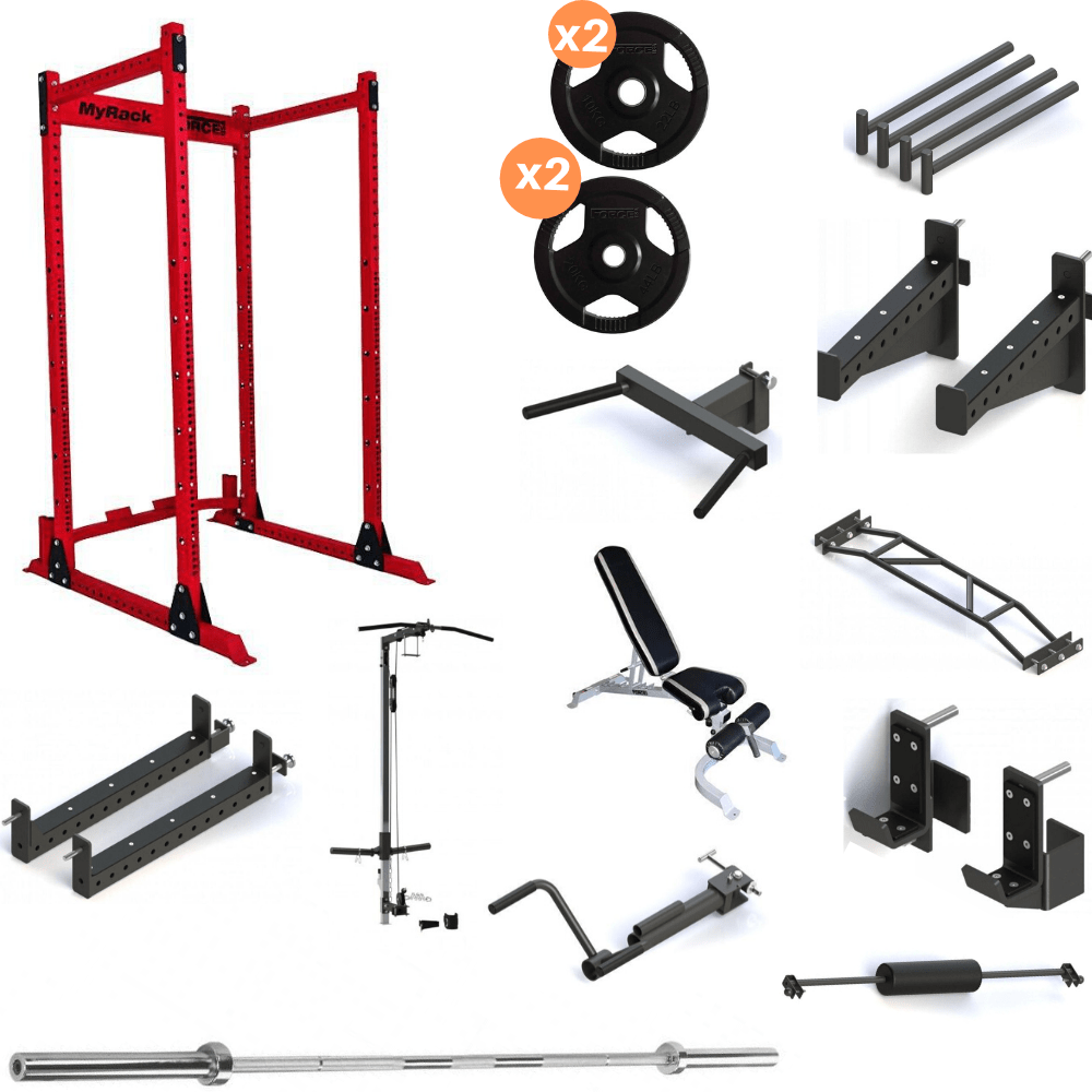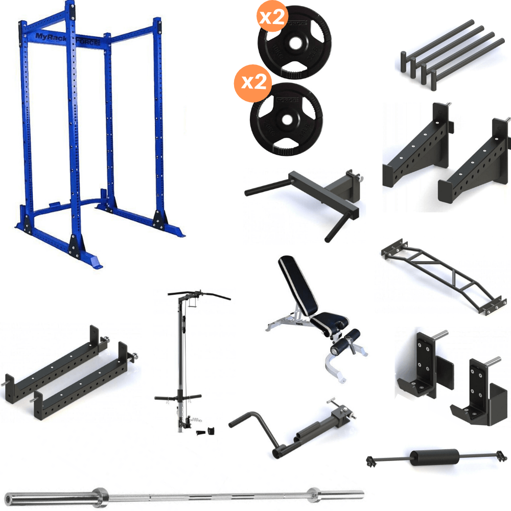 This Package includes the Force USA's MyRack Base unit coupled with a bunch of additional items that would broaden the exercise options of the user and their safety as well. It also includes an Olympic grade barbell along with its weights to enable further strength training.