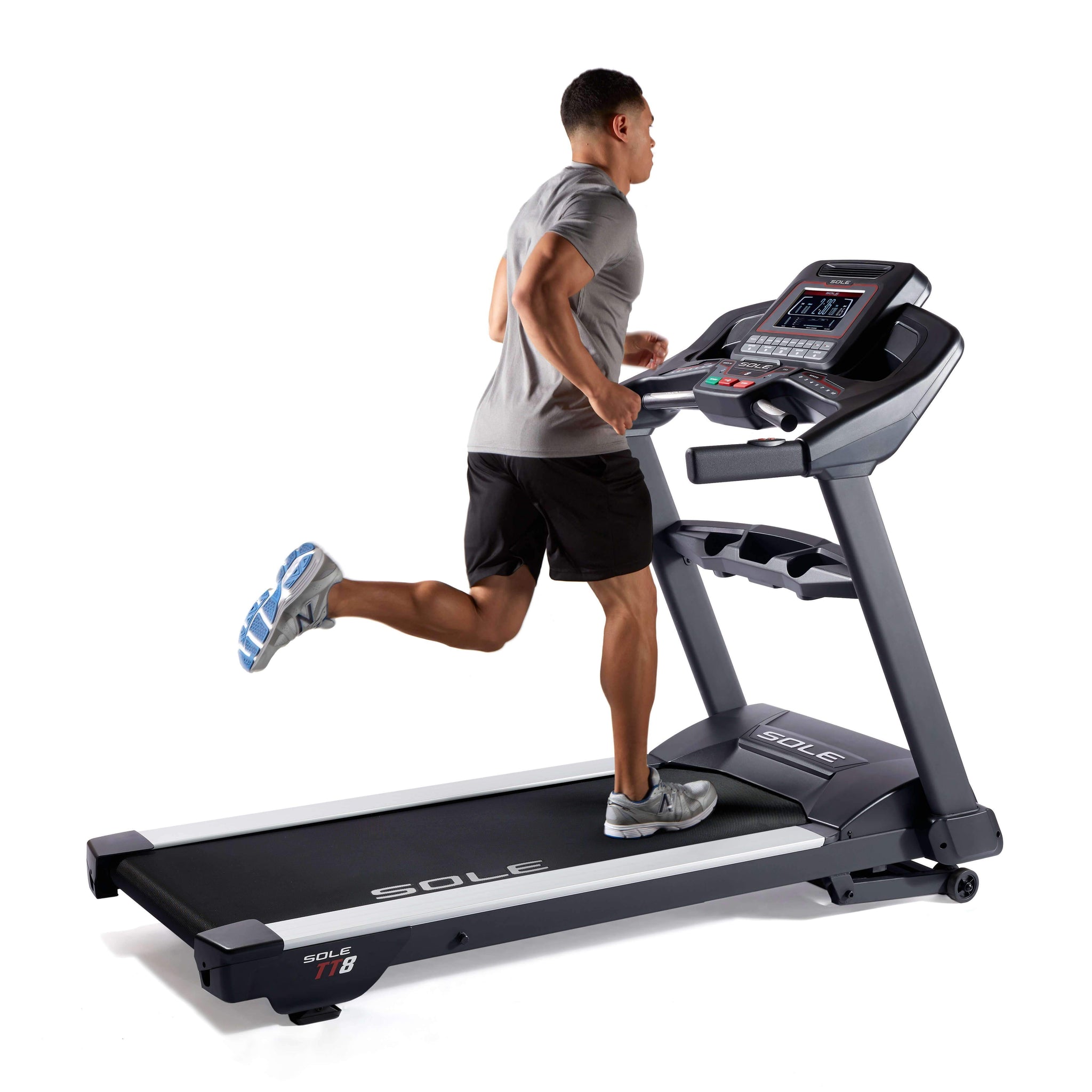 The Sole TT8 Treadmill has a 2 ply running belt, which is engineered similarly to the soles in running shoes. It offers a top speed of 18kph and decline/incline levels from -6 to 15, providing a variety of workout options. The pre-set programs not only challenge you to excel, but keep you on target for reaching personal fitness goals. The Heart Rate Control program keeps you on target for heart rate training, whether it be for losing weight or endurance training.